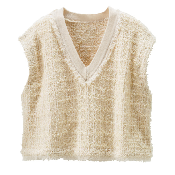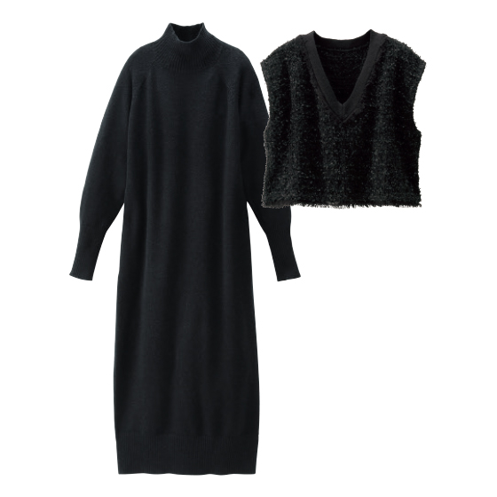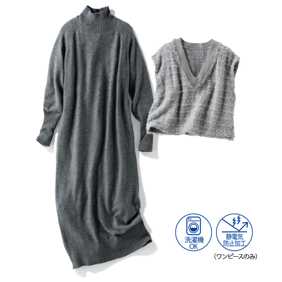 ●素材:ワンピース=ポリエステル30%・ナイロン25%・アクリル25%・レーヨン20%(ニット、天竺、静電気防止加工)、ベスト=アクリル55%・ポリエステル45%(ニット、ジャカード)