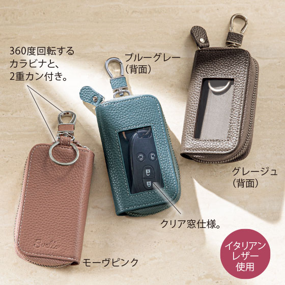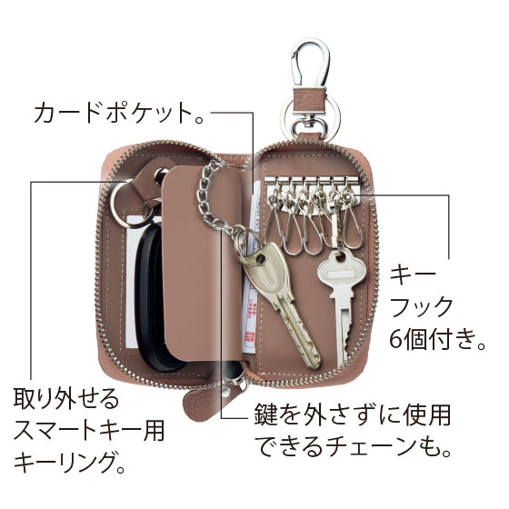 ●仕様:開閉=ラウンドファスナー式、ポケット=内部にキーリング1個・キーチェーン1個・カードポケット1個・キーフック6個付き