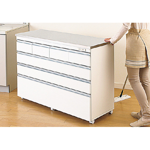 水・熱に強いステンレス天板。汚れはサッとひと拭きできれいに。後ろ姿もスッキリ。間仕切りに使える。移動がラクでお掃除しやすい。