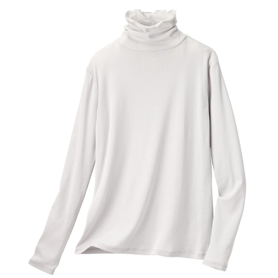 やわらかなオーガニックコットン混素材。薄手でモタつきにくいので、シャツやニットのインナーとして活躍します。表情のあるタートルネックで衿元が華やかな印象に。