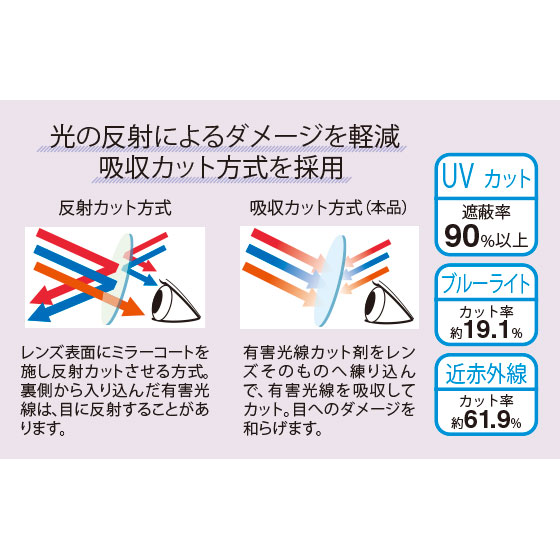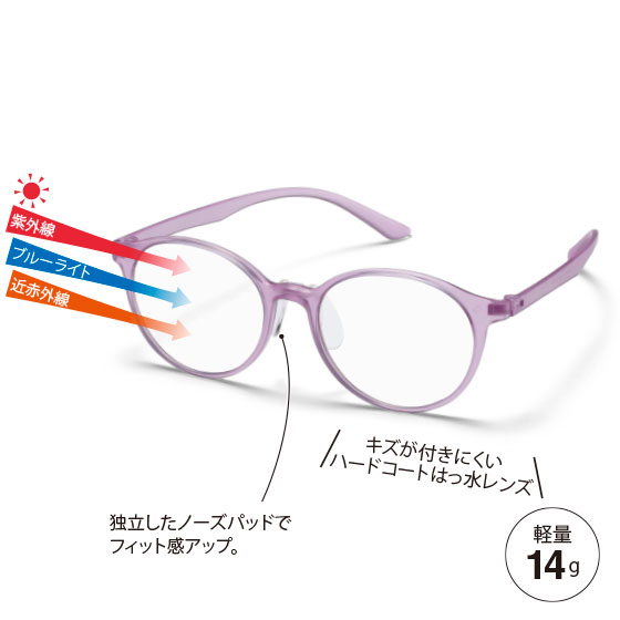 紫外線とブルーライトはもちろん、近赤外線にも対応し、光線を反射させずに吸収することで、目へのダメージを軽減するサングラス。軽量でやわらかな素材のフレームはかけていることを忘れてしまうほどの快適さ。夜になってもかけっぱなしOKのクリアなレンズで、日常生活での目を守る習慣に役立ちます。