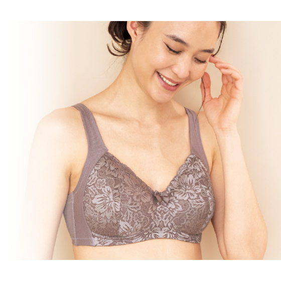 アンダーは寸法を見直して、ストレッチ素材に変え、くい込みを軽減。肩ひもは長くした上、テープを身生地で包んで肌当たりも向上。わき下辺は縁のテープを身生地でくるみ、ラクなつけ心地に。