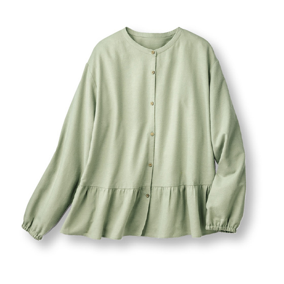 綿と麻をブレンドしたナチュラルな風合いの素材に微起毛加工をプラスしてやわらかな肌触りに。ペプラム切替のデザインだから、おなか回りもさりげなくカバー。