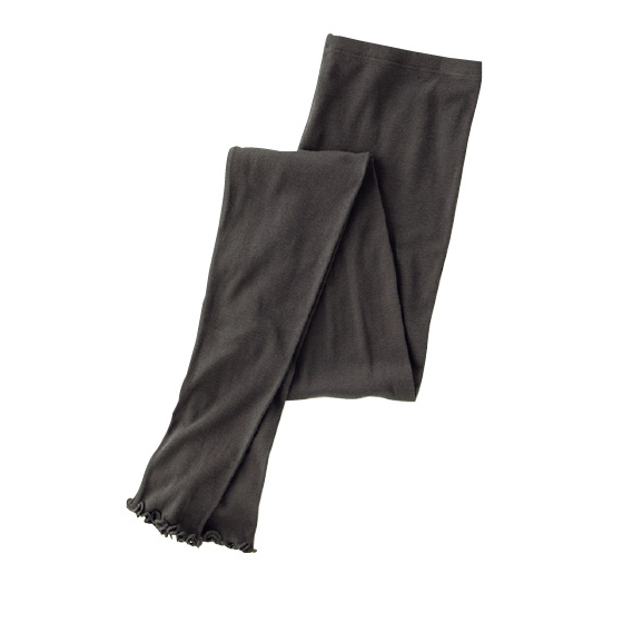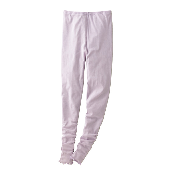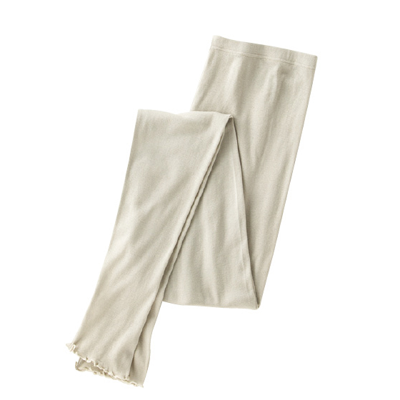 ふんわり軽く透け感のあるガーゼ調素材。おなかをすっぽり包む、深めの股上丈。裾は長め丈&フリル調メロウ仕上げ。