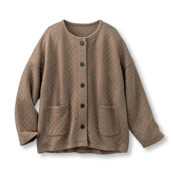 キルトの空気層に包まれてほっこり。洗濯機で洗えるのもうれしい。スマホもすっぽり大きめポケット。