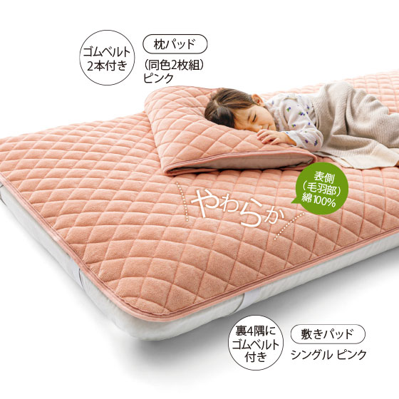 ●裏4隅にズレ防止のゴムベルト付き(敷きパッド)、ゴムベルト2本付き(枕パッド)