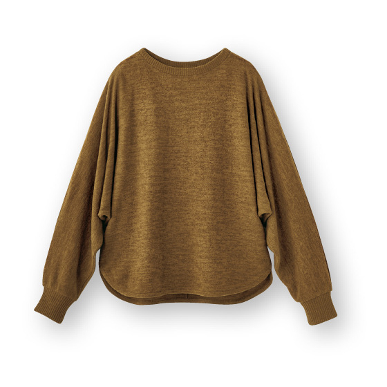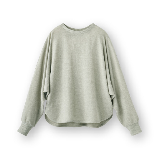 ふんわり軽く、チクチクしにくい、ニット見えのカットソー素材。ドルマンスリーブでゆったり着られ、今どきの丈感でボトムス合わせも好バランスに。袖口リブ仕様で袖アップも簡単。