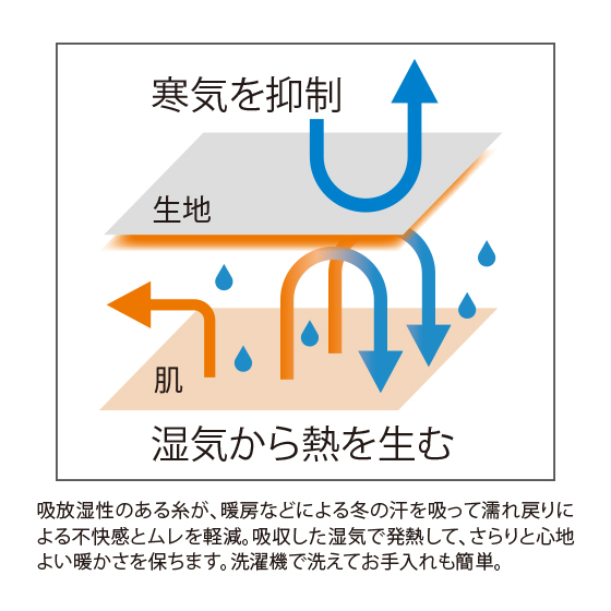 吸放湿性のある糸が、暖房などによる冬の汗を吸って濡れ戻りによる不快感とムレを軽減。吸収した湿気で発熱して、さらりと心地よい暖かさを保ちます。洗濯機で洗えてお手入れも簡単。