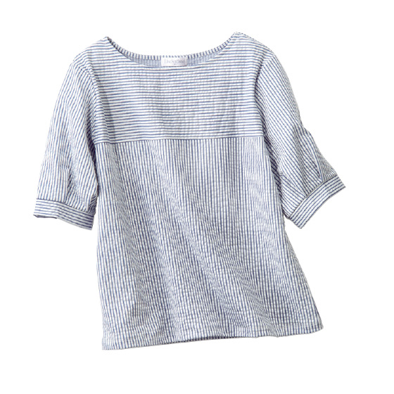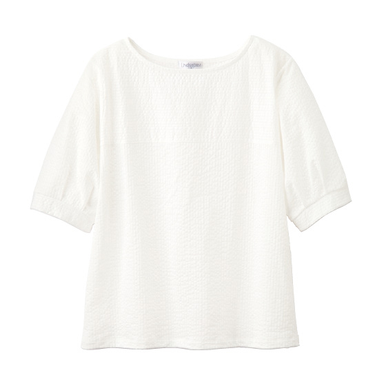ポコポコとした表面感のある、ほどよい厚みのカットソー。胸の切替やふんわりタック袖がアクセント。