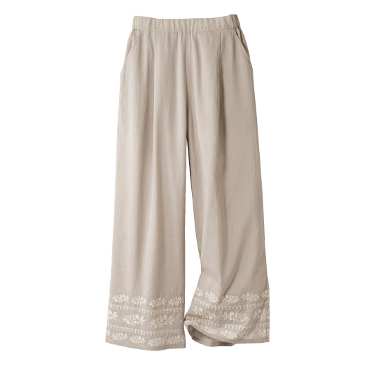 ほんのりエスニックな裾刺繍がアクセントになり、はくだけで夏気分♪ゆったりラクなはき心地で、気になる脚線もカバー。ウエストは3/4ゴムでラクなはき心地。裏地付きで透けにくい。※春夏に着用できます。