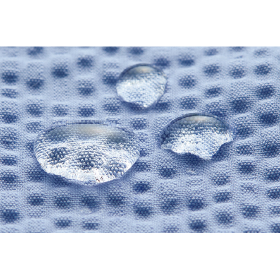 オーガニックコットン20%の綿混素材。凹凸感があって肌離れのよいサッカー生地に、はっ水・はつ油加工を施しました。