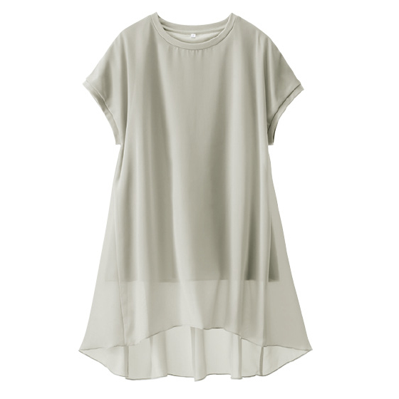 内側はカットソー、外側は長め丈のシフォン。1枚着るだけで涼しげに映えて、体形カバーも叶います。中だけボトムインして、透ける量のアレンジも。