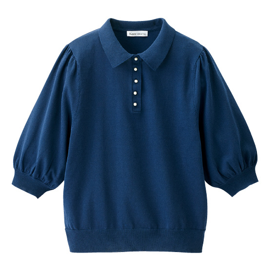 ふっくら袖とパールボタンがやさしいポロ衿ニット。衿付きだからきちんと見えも。