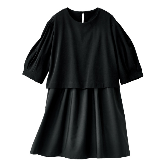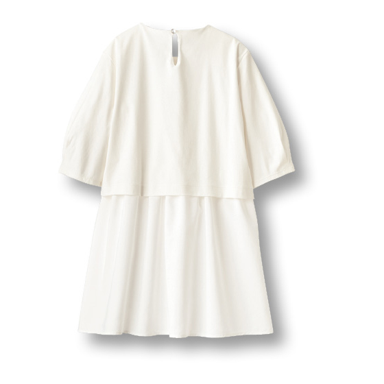 つやが上品な短丈カットソーと、裾がシャツ地切替のロングインナーが肩で合体。2枚重ねの自然なレイヤードが、時短で決まるチュニック。