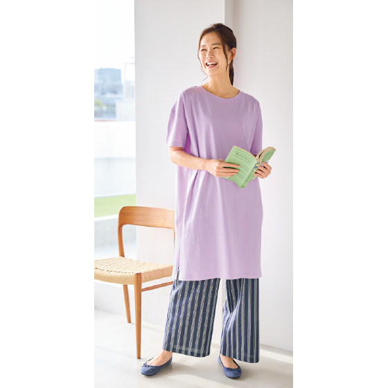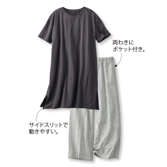 綿天竺のゆったりチュニックと汗ばんでもサラッとはける綿サッカーのパンツ。上下で素材を変え、それぞれ単独でも楽しめるセット。