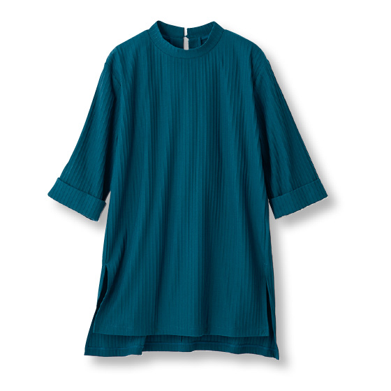 細く見えます。袖丈も他にない5分袖で活躍します。少しハイネックなところも上品です。ブルーグリーンもきれいです。