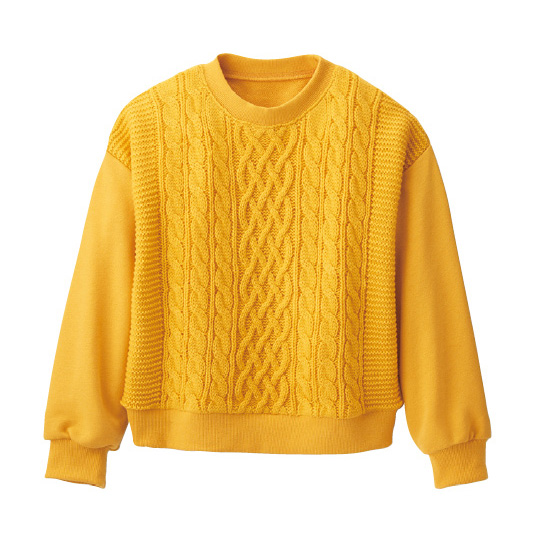 ●素材:本体=ポリエステル65%・綿35%(ニット、裏毛)、前身頃部分=アクリル100%(ニット、ケーブル)、リブ部分=ポリエステル65%・綿30%・ポリウレタン5%