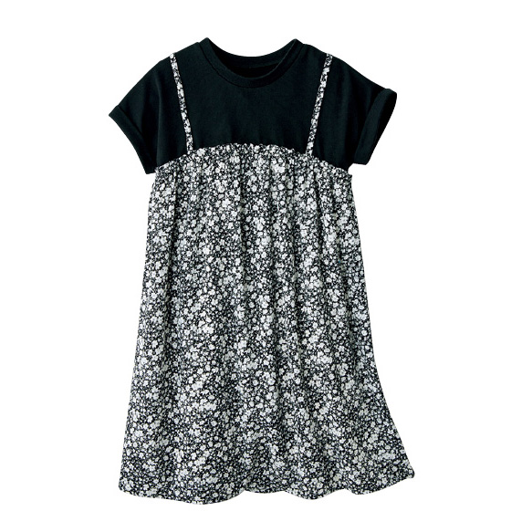 ●素材:カットソー部分=ポリエステル65%・綿35%(ニット、天竺、吸水速乾加工)、プリント部分=ドット柄/ポリエステル95%・ポリウレタン5%、小花柄/ポリエステル100%(織物、平織)、リブ部分=ポリエステル65%・綿30%・ポリウレタン5%