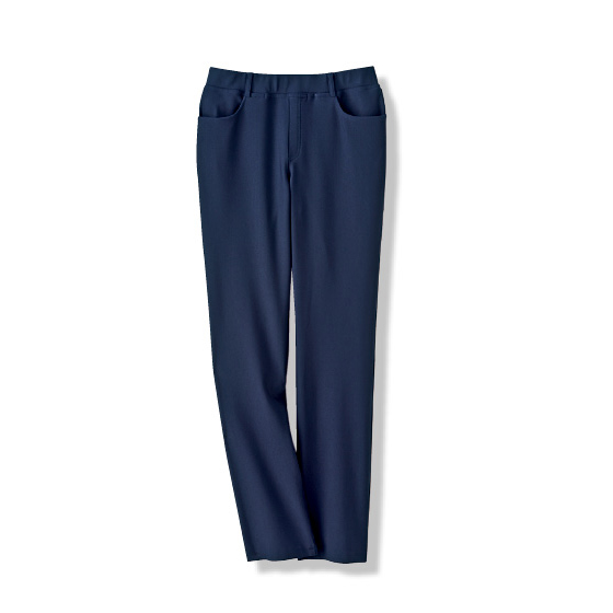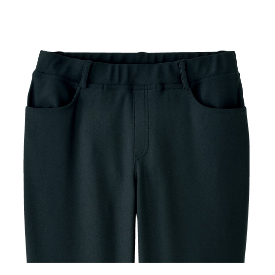 ウエスト総ゴムのプルオン仕様。フェイク前立てでフロントもきれい見え。