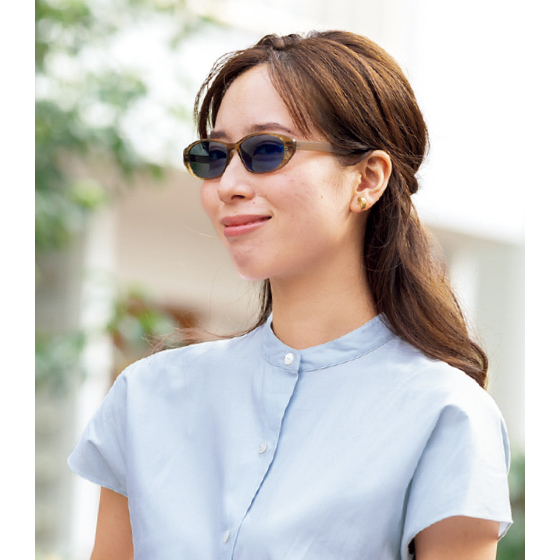 軽くてソフトな掛け心地。小顔見せデザインが魅力。屋外ではサングラス、室内ではPCグラスとしても活躍。ソフトケース付き。