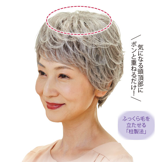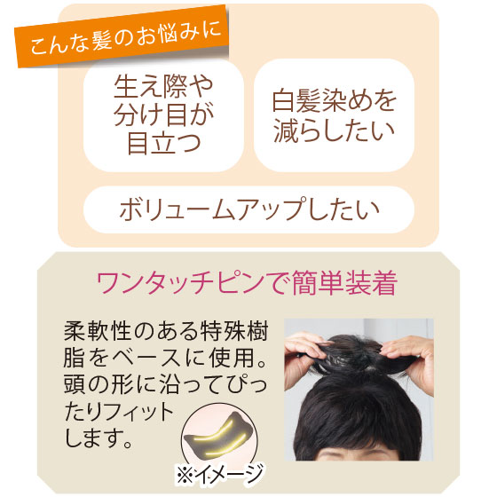 つむじのぺちゃんこが気になるけど、ウィッグで悪目立ちしたくない…。そんな悩みを救う、手軽で自然なミニヘアピースです。装着は、気になる頭頂部にポンと重ねるだけ。自毛のようにナチュラルなボリューム感で、つけていることを忘れるほどの軽さもうれしい。通販なら周りの視線を気にせずに自宅で試せるから、店頭での試着に抵抗がある方にもおすすめです。