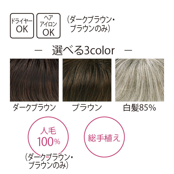●材質:ダークブラウン・ブラウン=人毛100%、白髪85%=人毛・ポリエステル