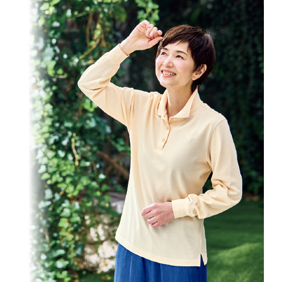 ほどよい厚みで肌離れがよく、通気性もある綿100%の鹿の子素材。腰回りをカバーする丈。両わきスリット入り。