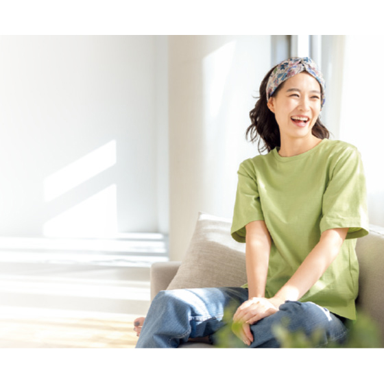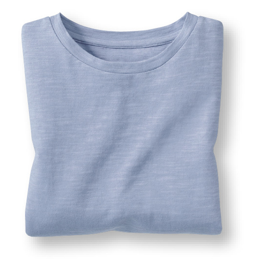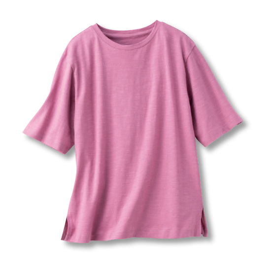 肌離れのいい表面感のあるスラブ天竺素材。ゆったり5分袖で二の腕カバー。両わきにスリット入り。