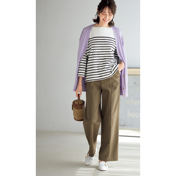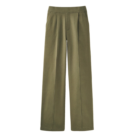 ウエスト総ゴムでラクなはき心地ながら、前ピンタックが縦ラインを強調してすっきり脚長見せ。ハリ感のあるストレッチツイル生地がすとんと落ちて、ワイドでもきれいなシルエットに。※着用シーズンは春秋冬です。
