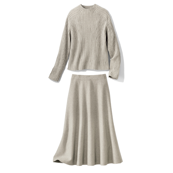 太めのリブが効いたプルオーバーと、ミラノリブ編みAラインスカートのセット。もちもち感のある伸縮ニットで着心地ラクちん。毛玉になりにくく、お手入れも簡単です。※冬に着用できます。