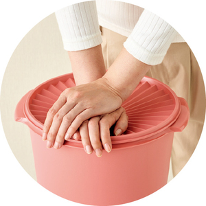 「タッパー」は、タッパーウェア社だけが使用できる登録商標。中でもデコレーターシリーズは、独自の技術が詰まっています。蓋の溝は10度毎に36本あり、この形状により、真ん中を押すだけで蓋の外側へ力が均等にかかり、空気を押し出しながらしっかり密封できます。緻密な製品設計により、乾燥から守り、液体やニオイが漏れにくい構造を実現しています。さらに軽量かつ丈夫なので使い勝手もよく、食品はもちろん洗剤や小物の収納など、使い道も広がります。