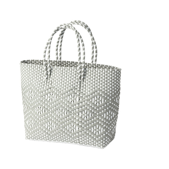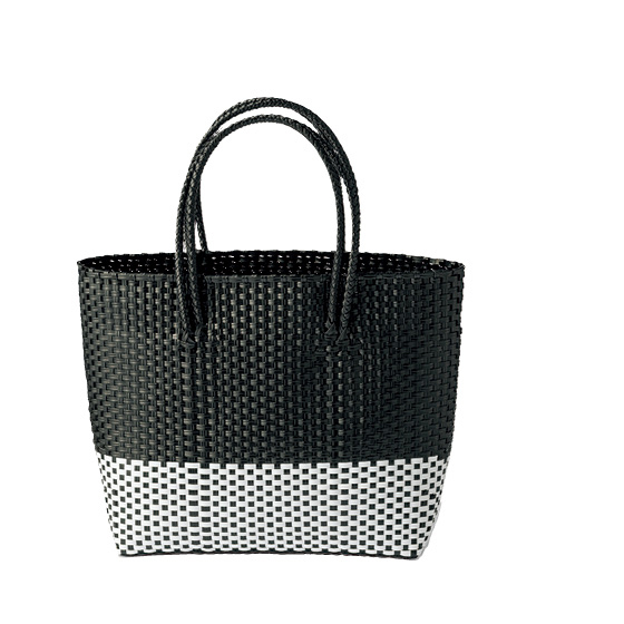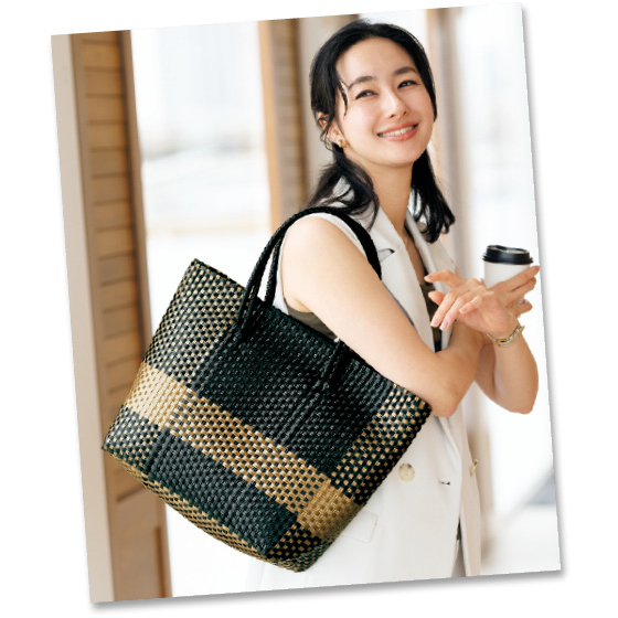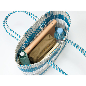 汚れが気になったら手軽に丸洗いOK。水に強い素材の編み込み仕上げ。安定感があり、収納たっぷり。口も広く出し入れがラクなマルシェ風バッグ。