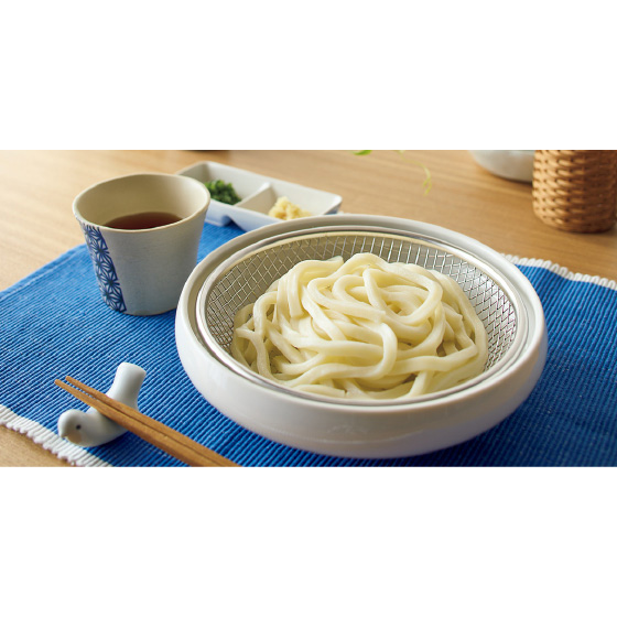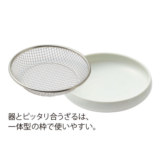 麺類の水切りにも。器とピッタリ合うざるは、一体型の枠で使いやすい。