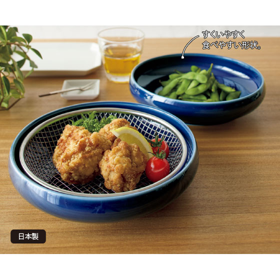 揚げたてを油切りして、そのまま食卓へ。洗いやすい油切りざると、趣のある美濃の器をセットに。