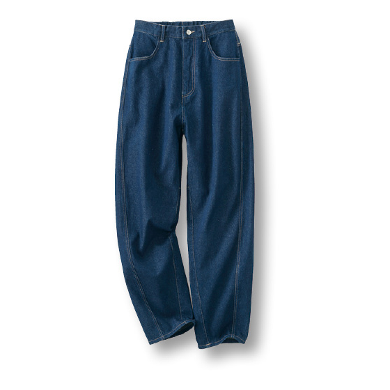 ゆるやかにカーブする丸みのあるシルエット。腰回りや脚線をカバーしながら、今どき見えも叶うデニムです。厚すぎないしなやかな生地で、大人にラクなはき心地。※通年着用できます。