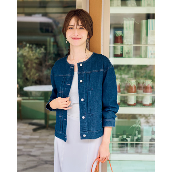 ノーカラーと腰骨丈ですっきり着られる人気Gジャン。前立て横の飾りタックや目立ちすぎない配色ステッチ、肩も少しドロップさせ、やさしい印象で着られます。