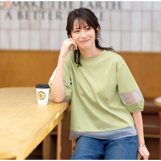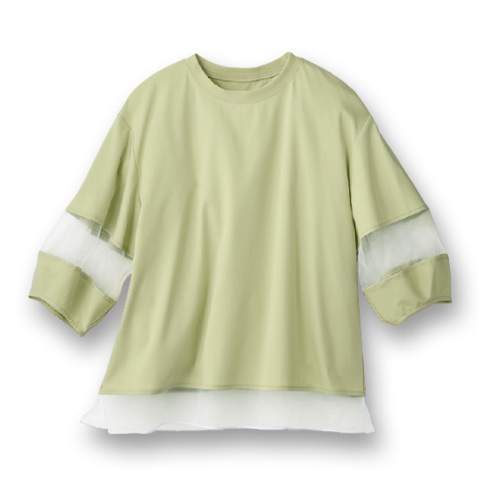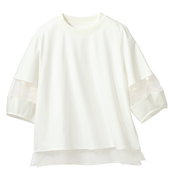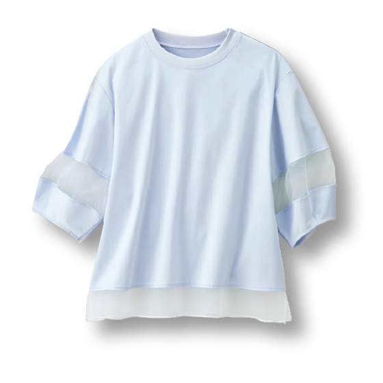 袖と裾のシアー切替が涼しげ。ボトムの上に着るだけで、インしたバランスに見えるカットソーです。体の線や二の腕カバーが叶うゆるシルエット。