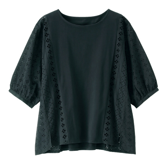 ●素材:ニット部分=ポリエステル65%・綿35%(ニット、天竺)、布帛部分=綿100%(織物、刺繍レース)