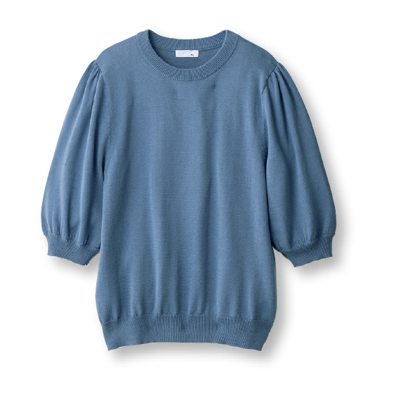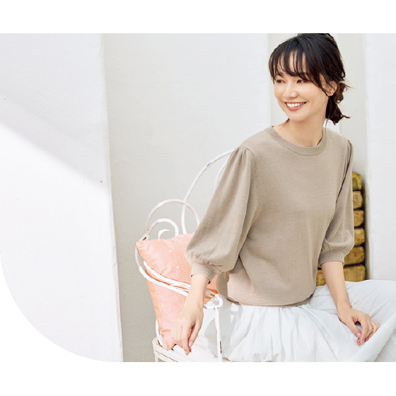 柔らかな中にシャリ味のある夏ニット。ギャザー使いの映え袖が、今見えしながら二の腕カバーも。着回しやすい色味で秋まで活躍。