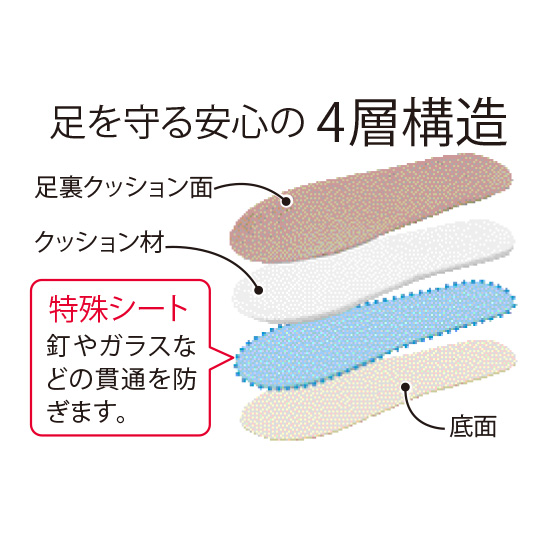 ※耐踏抜き性試験は、規定された条件での評価結果であり、実際のご使用環境において、すべての鋭利な物に対して完全に防止するものではありません。画びょうなど先が細く尖ったものを踏むと貫通するおそれがあります。※本品の耐踏抜き効果は真下からのみ得られます。