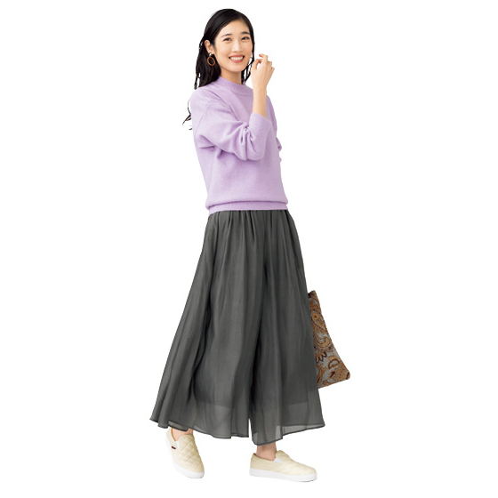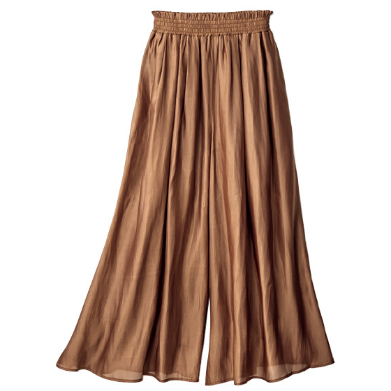 ほどよいハリ感と絶妙な落ち感でスカート見え。静電気防止加工を施した裏地裾にゴム入りなので、表地ごとくるくるたくし上げればトイレでも困りません。※通年着用できます。