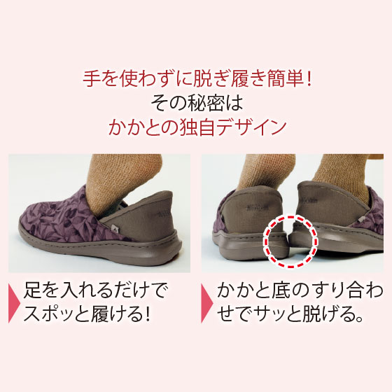 ハンズフリーで脱ぎ履きできてラク。しかも、心地よくフィットして、脱げにくく歩きやすい。おしゃれなデザインと底面の丈夫さもちょい履きにうれしい安心&便利な一足です。