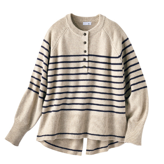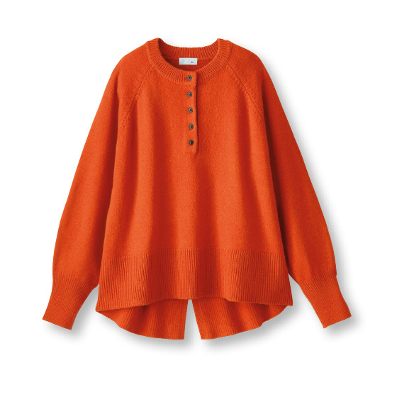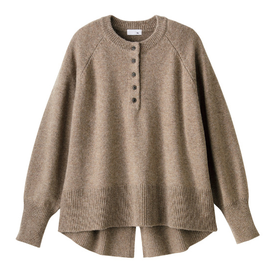 衿元ボタンの開け閉めで、印象が変わるヘンリーネック。スリット入りの後ろ裾で、ヒップをカバーしつつ抜け感をプラス。