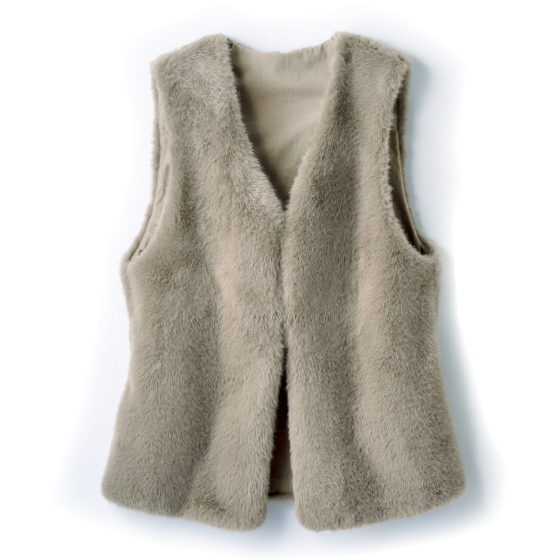 1枚で視線を集めるフェイクファー。すっきり肩幅、大きなV開き、深く繰った袖ぐりでふくらみすぎず、リアル見えする毛並みでコーデが旬映え。パチパチを抑える綿100%裏地。