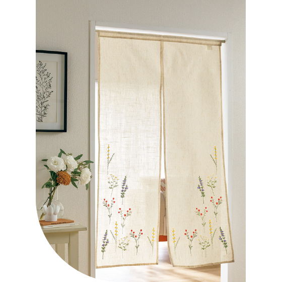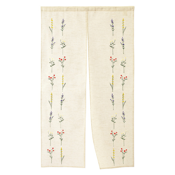 花の刺繍が風にやさしく揺れて。ほどよく光を通す麻混のれん。