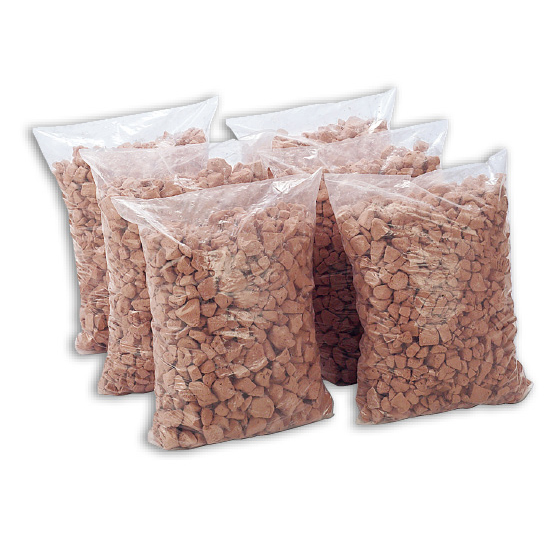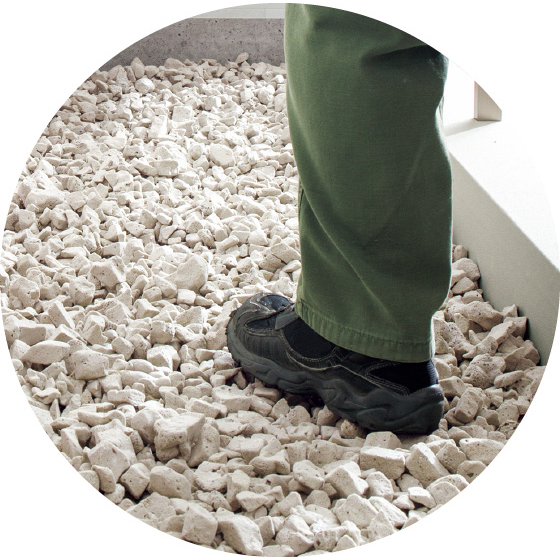 踏むと大きな音が出る防犯に適したジャリ。ガラスを高温溶解し、発泡処理したもので、粒の中に空気を多量に含み、軽くて、扱いやすい。多孔質なので水を通し、鉢底石としても使用可能。