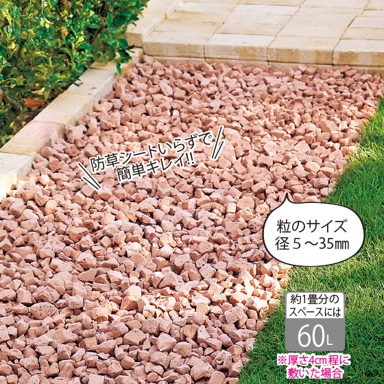 ※使用目安:20L×3袋(60L)で約1畳分に敷くことができます。厚さ4cm程度に敷きつめてご使用ください。当品は発泡材を加え高温で焼成した後、破砕加工を施し角を取り除いています。リサイクルガラスを使用しているため、ジャリの色合いに多少のバラツキが発生する場合があります。素材特性により軽いため、雨量が多く流れる場所に敷く際には段差等で流出を防止してください。