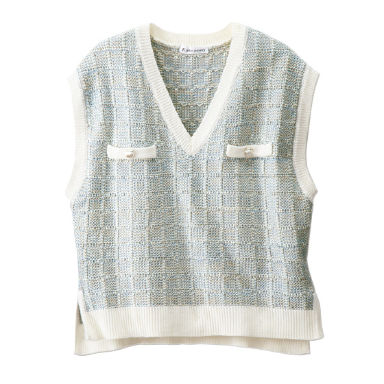 キラキラとラメが輝くチェック柄が、リッチな雰囲気。着ぶくれしにくいサイズ感で、すっきり見えるベストです。サラッと感触で春先から長く活躍。