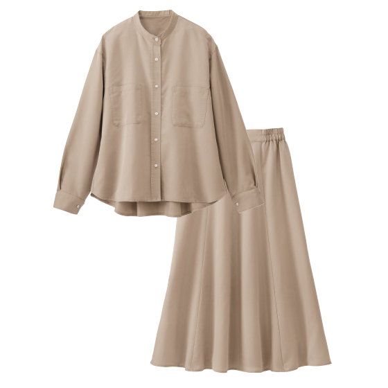 落ち感ですっきり細見えする、シャツ&フレアスカートのセットアップ。上下で着ると上品なワンピ見えし、単品使いでも大人のきれいカジュアルが完成。※春夏秋、3シーズンに着用できます。