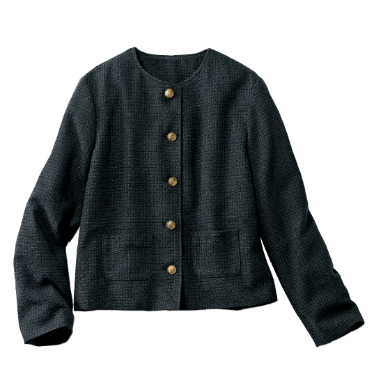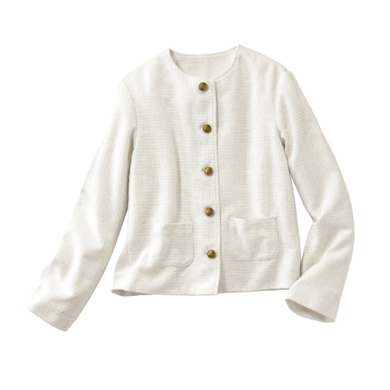 上品ツイードを、コンパクトめのシルエットとアンティーク風ボタンでこなれ見えするジャケットに。きれいめからカジュアルまで活躍。